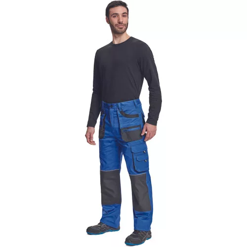 • férfi munkanadrág • 6 multifunkciós zseb • OXFORD poliészter erősítésekkel az igénybevett részeken • térdvédő behelyezésére alkalmas, megerősített térdrész • leengedhető szárak • anyaga 100% pamut, 235g/m2