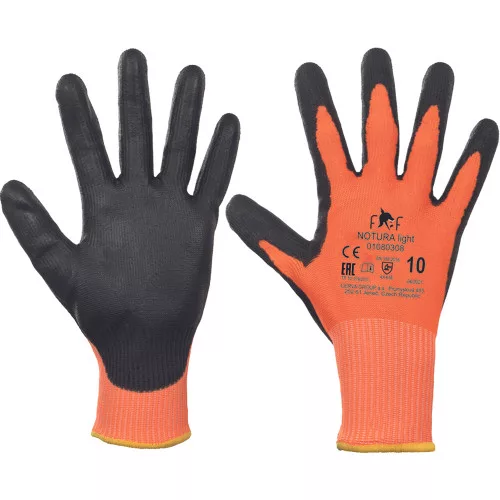 • a tenyéren és az ujjakon fekete PU mártott, varratmentes, kötött kesztyű • E szintű vágásvédelemmel