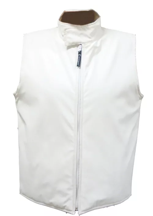 Külső: 200 g/m2 vastag 100% poliészter poliuretánnal borítva, 100 g/m2 vastag poliészter bélésű, selymes 190T taft belsővel készült fehér mellény* hegesztéssel vízhatlanított varrás* tépőzáras álló gallér* végig cipzáras, két külső oldalzsebbel