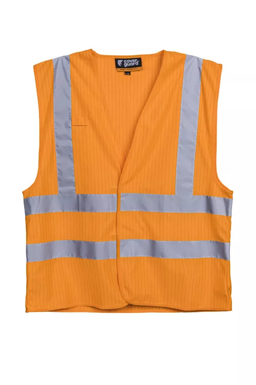 98% poliészter + 2% antisztatikus szál - 120 g/m2 vastag4 lángálló FR fényvisszaverő csíkA mellény szélessége állítható