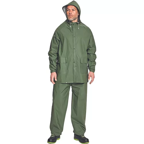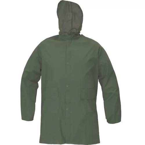 • kétrészes vízálló öltöny – 3/4-es kapucnis esőkabát és rugalmas derekú nadrág • lehegesztett varratokkal • PVC bevonatú poliészterből • 2 mély zsebfedős oldalzseb • patenttal szűkíthető mandzsetták • szellőzőbetétek a háton és a hónaljrészen