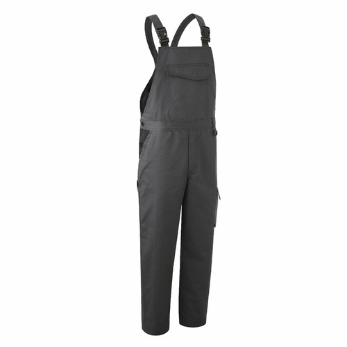 300 g/m2 vastag, 60% pamut + 40% poliészter kevertszálas alapanyag, regular szabású, vastag kopásálló melles nadrág sötétszürke színben,állítható műanyag csatos vállpánt,övbújtatók, sok zseb, kényelmi betét a láb között,gombbal záródó, oldalt gumírozott és oldalgombos derék,megerősített térdrész, a száron még 5 cm-es lehajtási lehetőséggel