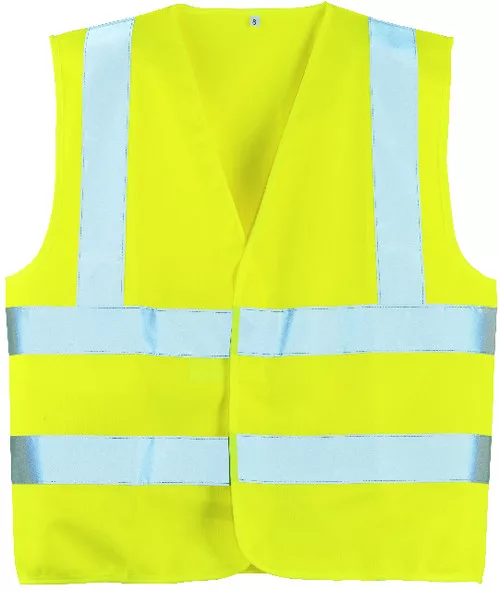 * szellőző, könnyű 120 g/m2 poliészter anyag, élénk, fluo színekben* kettő vízszintes, egy függőleges, 5 cm széles fényvisszaverő csík* tépőzárral állítható bőség* univerzális XL méret, jól láthatósági sárga (70242), rendelhető, sárga színű speciális méretek: nagy XXL-es (70243)