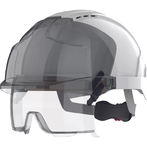 » az EVO® VISTAlens® újgenerációs, funkciókban gazdag védősisak, beépített szemvédővel » erős és könnyű ABS héj , Evolution® 3D-Adjustment™ hevederrendszer » Chamlon™ pamut izzadságpánt » EN 397 LD MM -40°C (olvadt fémcseppek ellen, oldalirányú deformációra tesztelve, -40°C° +50°C-ig használható) » EN 166 1 BT KN (1. optikai osztály, karcálló bevonat, párásodást gátló réteg, közepes energiájú szemcsék elleni védelem) » EN 170 2C-1.2 (UV-sugárzás elleni védelem » magas színfelismerés, víztiszta látómező) » EN 50365 1000V-ig elektromosan szigetel