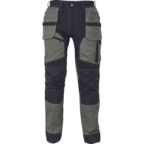 • férfi munkanadrág rugalmas derékkal • 2 oldalsó zseb, két szerszámtartó zsebbel elöl • D-gyűrű • 1 oldalsó zseb a lábon hajtókával • 1 oldalsó zseb cipzárral • 2 hátsó hajtókás zseb • megerősített térdrész, térdvédőtartó • 5 cm-rel meghosszabbítható nadrágszárak • a nadrág hátsó, alsó része megerősített • dekoratív varratok • 265 g/m2