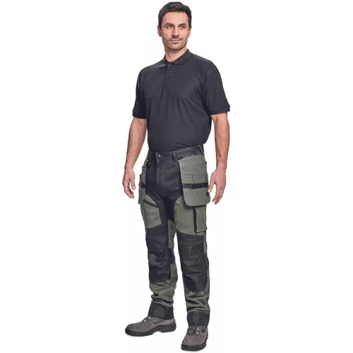 • férfi munkanadrág rugalmas derékkal • 2 oldalsó zseb, két szerszámtartó zsebbel elöl • D-gyűrű • 1 oldalsó zseb a lábon hajtókával • 1 oldalsó zseb cipzárral • 2 hátsó hajtókás zseb • megerősített térdrész, térdvédőtartó • 5 cm-rel meghosszabbítható nadrágszárak • a nadrág hátsó, alsó része megerősített • dekoratív varratok • 265 g/m2
