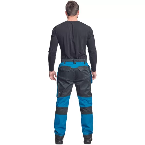 • férfi munkanadrág rugalmas derékkal • 2 oldalsó zseb, két szerszámtartó zsebbel elöl • D-gyűrű • 1 oldalsó zseb a lábon hajtókával • 1 oldalsó zseb cipzárral • 2 hátsó hajtókás zseb • megerősített térdrész, térdvédőtartó • 5 cm-rel meghosszabbítható nadrágszárak • a nadrág hátsó, alsó része megerősített • dekoratív varratok • 265 g/m2