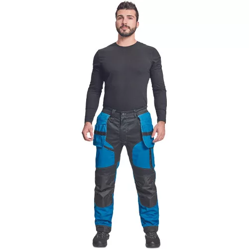 • férfi munkanadrág rugalmas derékkal • 2 oldalsó zseb, két szerszámtartó zsebbel elöl • D-gyűrű • 1 oldalsó zseb a lábon hajtókával • 1 oldalsó zseb cipzárral • 2 hátsó hajtókás zseb • megerősített térdrész, térdvédőtartó • 5 cm-rel meghosszabbítható nadrágszárak • a nadrág hátsó, alsó része megerősített • dekoratív varratok • 265 g/m2