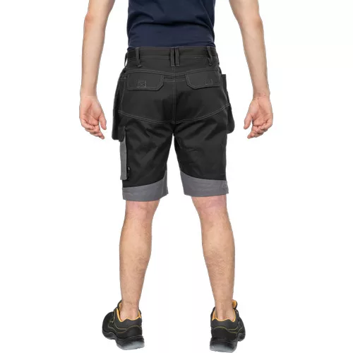 • férfi munkanadrág rugalmas derékkal • elöl 2 szerszámzsebbel, 1 cipzáras oldalzsebbel, 1 zsebfedős oldalzsebbel a szárakon, 2 zsebfedős hátsó zsebbel, D-gyűrűvel • dekoratív varratok