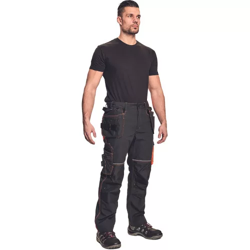 • férfi munkanadrág rugalmas derékkal • 2 oldalsó zseb, 2 repülőzseb szerszámtartó hurokkal, 1 átlátszó zseb az igazolvány számára, D-gyűrű • 2 hátsózseb • kalapácstartó kontrasztos színben • megerősített térdrész, térdvédőtartó • 5 cm-rel meghosszabbítható nadrágszárak • a nadrágszár hátsó, alsó része megerősített • dekoratív, figyelemfelkeltő varrás színes cérnával
