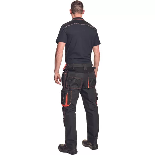 • férfi munkanadrág rugalmas derékkal • 2 oldalsó zseb, 2 repülőzseb szerszámtartó hurokkal, 1 átlátszó zseb az igazolvány számára, D-gyűrű • 2 hátsózseb • kalapácstartó kontrasztos színben • megerősített térdrész, térdvédőtartó • 5 cm-rel meghosszabbítható nadrágszárak • a nadrágszár hátsó, alsó része megerősített • dekoratív, figyelemfelkeltő varrás színes cérnával