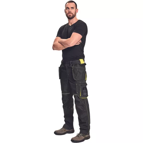 • férfi munkanadrág rugalmas derékkal • 2 oldalsó zseb, 2 repülőzseb szerszámtartó hurokkal, 1 átlátszó zseb az igazolvány számára, D-gyűrű • 2 hátsózseb • kalapácstartó kontrasztos színben • megerősített térdrész, térdvédőtartó • 5 cm-rel meghosszabbítható nadrágszárak • a nadrágszár hátsó, alsó része megerősített • dekoratív, figyelemfelkeltő varrás színes cérnával