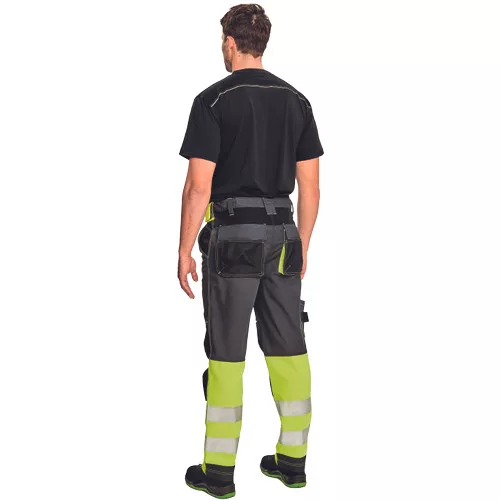 • férfi nadrág jólláthatósági kivitelben a szárak alján két fényvisszavető csíkkal • rugalmas derék • 2 oldalzseb • multifunkciós zseb a jobb lábon • D-gyűrű • hátul 2 zsebfedős zseb • kontrasztos kalapácstartó • megerősített térdrész, térdvédőtartó • 5 cm-rel bővíthető hossz • a nadrágszár hátsó, alsó része megerősített • kontrasztos, jól látható varratok