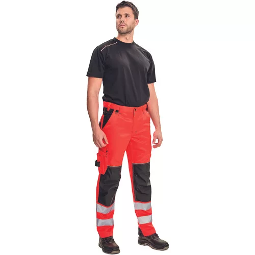 • férfi nadrág rugalmas derékkal jólláthatósági kivitelben • 2 oldalzseb • 1 multifunkciós zseb a lábszáron • D-gyűrű • 2 hátsó zseb • kalapácstartó kontrasztos színben • megerősített térdrész, térdvédőtartó • 5 cm-rel meghosszabbítható szárak • a nadrágszár hátsó, alsó része megerősített