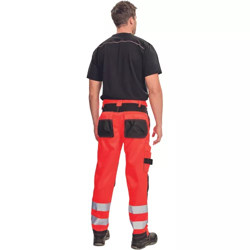 • férfi nadrág rugalmas derékkal jólláthatósági kivitelben • 2 oldalzseb • 1 multifunkciós zseb a lábszáron • D-gyűrű • 2 hátsó zseb • kalapácstartó kontrasztos színben • megerősített térdrész, térdvédőtartó • 5 cm-rel meghosszabbítható szárak • a nadrágszár hátsó, alsó része megerősített