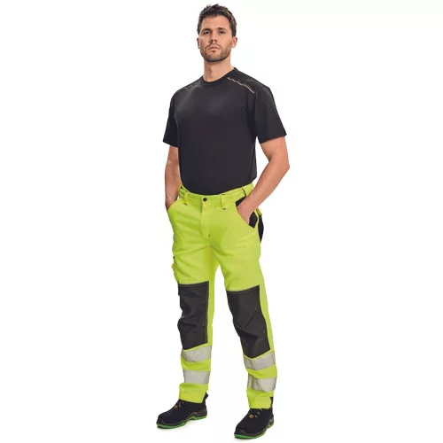 • férfi nadrág rugalmas derékkal jólláthatósági kivitelben • 2 oldalzseb • 1 multifunkciós zseb a lábszáron • D-gyűrű • 2 hátsó zseb • kalapácstartó kontrasztos színben • megerősített térdrész, térdvédőtartó • 5 cm-rel meghosszabbítható szárak • a nadrágszár hátsó, alsó része megerősített