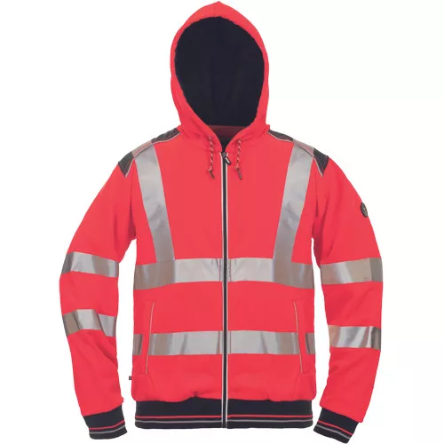 • kevertszálas, jólláthatósági kapucnis kardigán cipzárral • 2 db 5 cm-es szegmentált fényvisszavető csíkkal a derékrészen, az ujjakon és a vállakon • bolyhosodásmentes francia frottír szövet belső, kétrétegű kapucni, dekoratív tűzések • rugalmas mandzsetta és alsó szegély