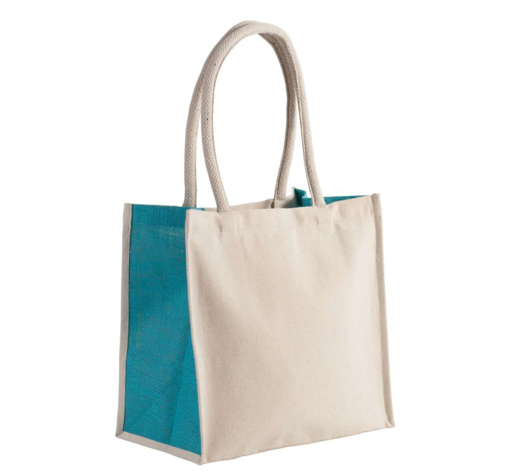 • Pamutvászon tote táska jutavászonból készült, kontrasztos oldalsó panelekkel