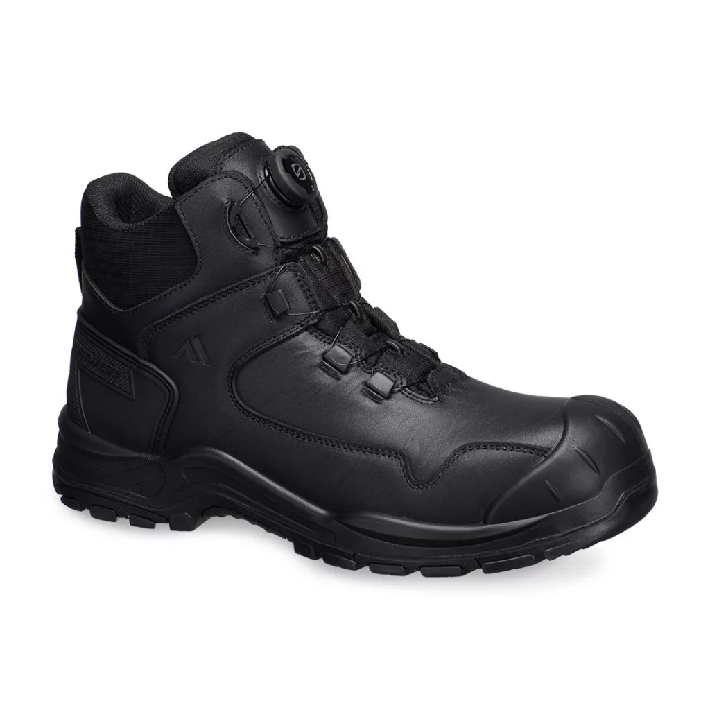This stylish full grain leather ankle boot, provides supreme comfort, with a padded collar and tongue, plus a premium EVA footbed, It also includes a non-metallic composite toe cap and midsole. It is constructed with an innovative wire lace system, for fast, one handed adjustment and quick release. This boot also features a heat resistant outsole with excellent slip resistance. The engineered tread pattern aids agility on uneven terrain whilst also being resistant to fuel oil and water.