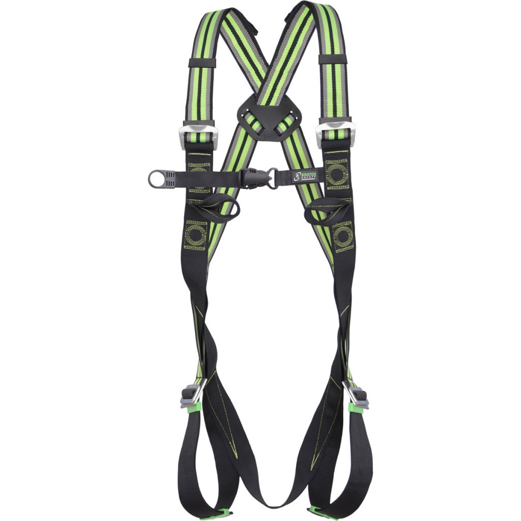 Biztonság és kényelem: Ez a testheveder két rögzítő ponttal rendelkezik, amelyek közül az egyik a háton található D-gyűrűvel, a másik pedig két mellkasra rögzíthető textilhurokkal van ellátva a leesés megállításához. Az állítható combpántok, csúszólapok és mellkasi heveder segítik a kényelmes pozíció beállítását.