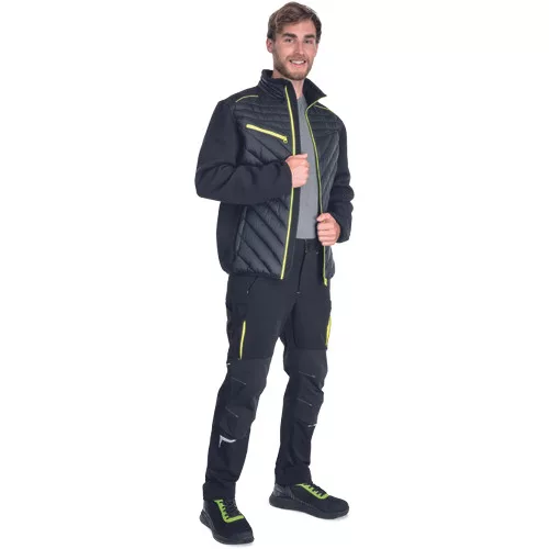 • dzseki steppelt anyag és kötött ujjak kombinációjával • jól láthatósági színkiemelés és fényvisszavető részletek • 2 oldalzseb • cipzáras mellzseb