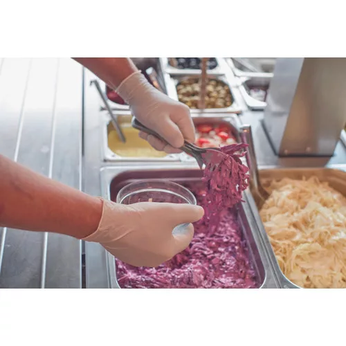 • élelmiszerekkel való rövid idejű érintkezésre alkalmas, egyszerhasználatos, púderezett latex kesztyű • AQL < 1,5