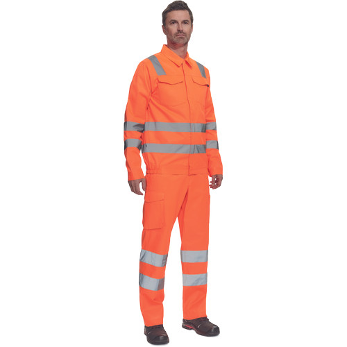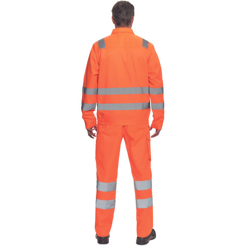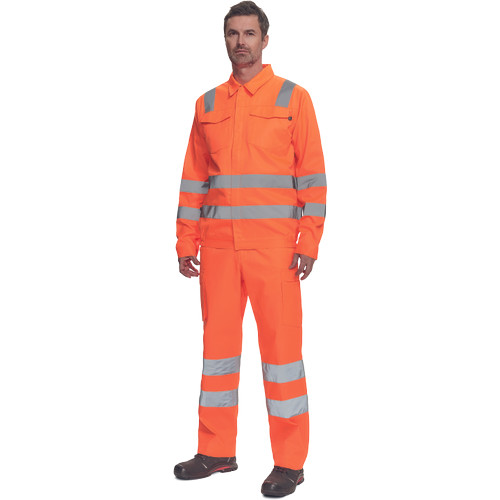 • férfi Hi-Vis kabát 5 cm széles fényvisszavető csíkokkal • cipzáras, tépőzáras hajtókával • 2 nagy hajtókás mellkasi zseb • rugalmas oldalsó betétek a kabát alján • tépőzáras mandzsetta