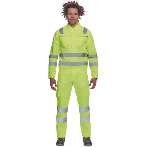 • férfi Hi-Vis kabát 5 cm széles fényvisszavető csíkokkal • cipzáras, tépőzáras hajtókával • 2 nagy hajtókás mellkasi zseb • rugalmas oldalsó betétek a kabát alján • tépőzáras mandzsetta