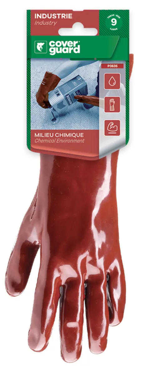 * 36 cm hosszú, pamutra mártott bordó PVC védőkesztyű* sav-, lúg- és olajálló és mikroorganizmusok elleni védelemmel* 1 mm vastag PVC mártás* higiénikus Actifresh(R) kiképzés a szagok és kórokozók (gombák, baktériumok) megelőzésére
