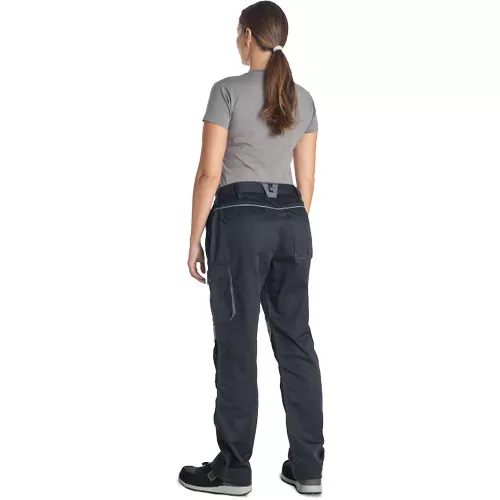 • női munkanadrág rugalmas derékpánttal • 2 oldalzseb • 1 bal combzseb • 2 hátsó zseb tépőzárral • térderősítés opcionálisan behelyezhető térdpárnával • fényvisszavető részletek • állítható szárhossz