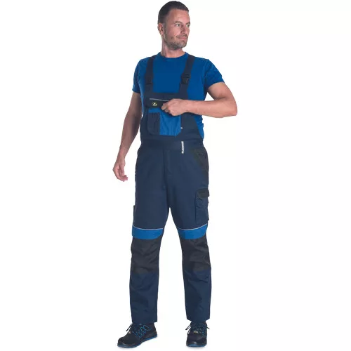 • férfi munkás mellesnadrág rugalmas derékpánttal • 2 oldalzseb • 1 combzseb • 1 mellzseb tépőzárral • 2 hátsó zseb tépőzárral