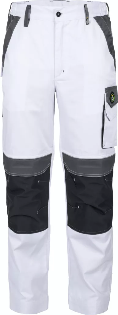 • férfi munkanadrág rugalmas derékpánttal • 2 oldalzseb • 1 bal combzseb • 2 hátsó zseb tépőzárral • térdrész erősítés opcionálisan behelyezhető térdpárnával • fényvisszavető részletek • állítható szárhossz