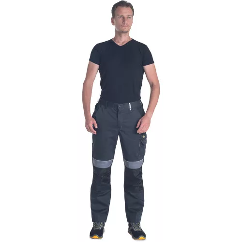 • férfi munkanadrág rugalmas derékpánttal • 2 oldalzseb • 1 bal combzseb • 2 hátsó zseb tépőzárral • térdrész erősítés opcionálisan behelyezhető térdpárnával • fényvisszavető részletek • állítható szárhossz