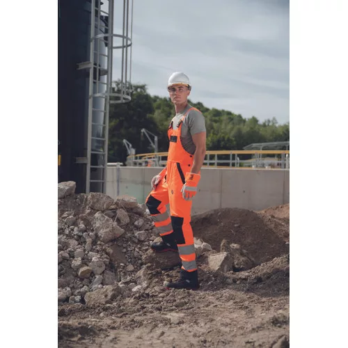• férfi HI-VIS munkanadrág rugalmas derékrésszel • 2 oldalzseb • 1 combzseb • 1 mellzseb cipzárral • 2 hátulsó zseb tépőzárral • 2 bevarrt, 7,5 cm széles fényvisszavető csík a lábszáron • megerősített térdrész • hosszabbítható szárhossz