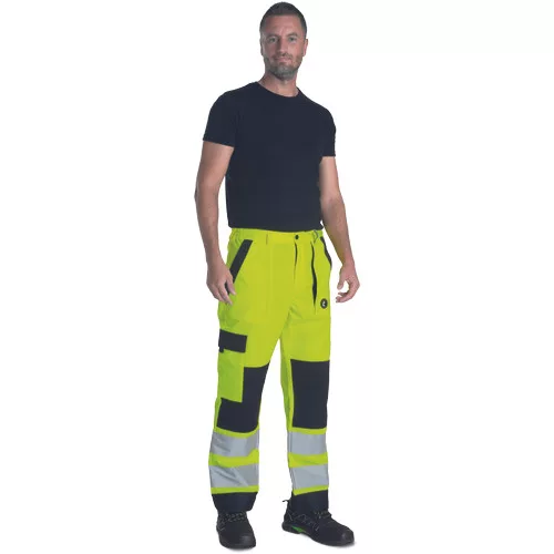 • Férfi HI-VIS munkanadrág rugalmas derékrésszel • 2 oldalzseb • 1 combzseb • 2 hátulsó zseb tépőzárral • 2 bevarrt, 7,5 cm széles fényvisszavető csík a lábszáron • megerősített térdrész • hosszabbítható szárhossz
