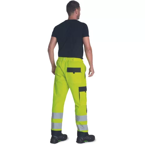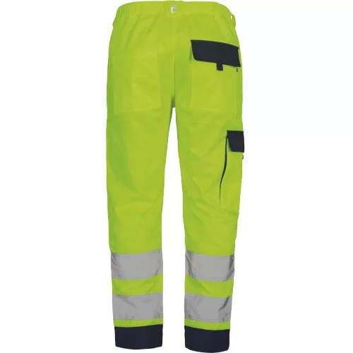 • Férfi HI-VIS munkanadrág rugalmas derékrésszel • 2 oldalzseb • 1 combzseb • 2 hátulsó zseb tépőzárral • 2 bevarrt, 7,5 cm széles fényvisszavető csík a lábszáron • megerősített térdrész • hosszabbítható szárhossz