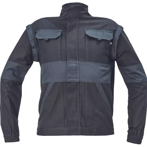 • férfi cipzáras munkakabát levehető ujjakkal • 2 oldalzseb, 2 mellzseb • megerősítés a váll- és könyökrészeken • rugalmas mandzsetta és derékpánt • anyag: 100% pamut, anyagvastagság: 260 g/m2