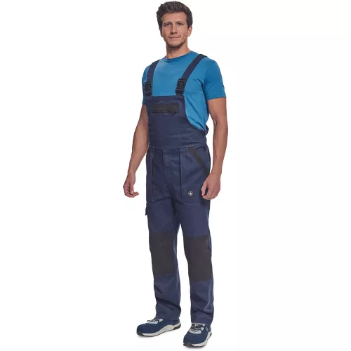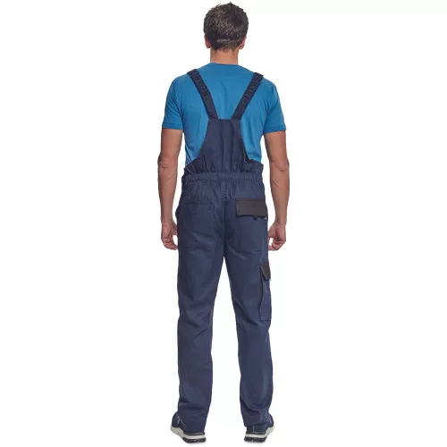 • férfi mellesnadrág rugalmas derékkal, széles pántokkal, műanyag csatokkal • 2 első zseb, 1 oldalzseb, 1 nagy mellzseb, 2 hátsó zseb • megerősített térdrész • leengedhető szárak