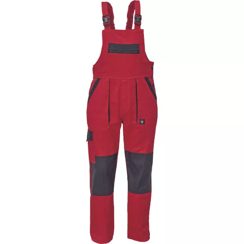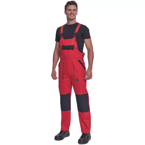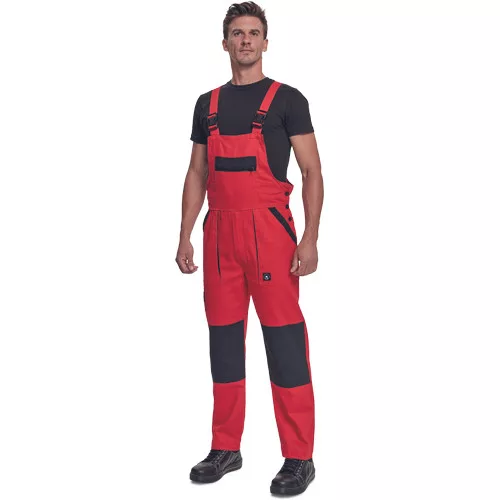 • férfi mellesnadrág rugalmas derékkal, széles pántokkal, műanyag csatokkal • 2 első zseb, 1 oldalzseb, 1 nagy mellzseb, 2 hátsó zseb • megerősített térdrész • leengedhető szárak