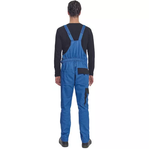 • férfi mellesnadrág rugalmas derékkal, széles pántokkal, műanyag csatokkal • 2 első zseb, 1 oldalzseb, 1 nagy mellzseb, 2 hátsó zseb • megerősített térdrész • leengedhető szárak