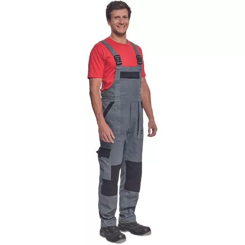 • férfi mellesnadrág rugalmas derékkal, széles pántokkal, műanyag csatokkal • 2 első zseb, 1 oldalzseb, 1 nagy mellzseb, 2 hátsó zseb • megerősített térdrész • leengedhető szárak