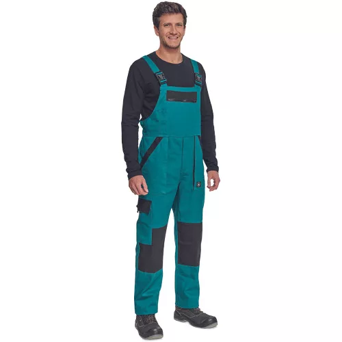 • férfi mellesnadrág rugalmas derékkal, széles pántokkal, műanyag csatokkal • 2 első zseb, 1 oldalzseb, 1 nagy mellzseb, 2 hátsó zseb • megerősített térdrész • leengedhető szárak