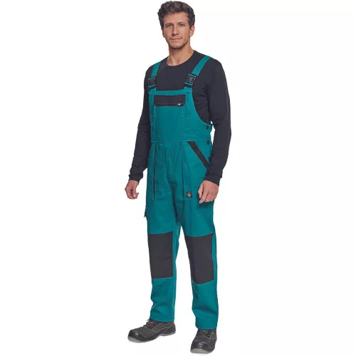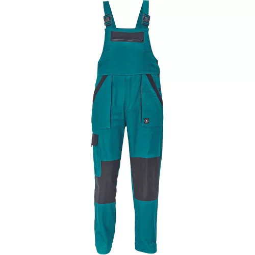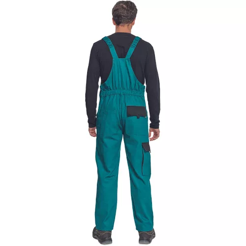 • férfi mellesnadrág rugalmas derékkal, széles pántokkal, műanyag csatokkal • 2 első zseb, 1 oldalzseb, 1 nagy mellzseb, 2 hátsó zseb • megerősített térdrész • leengedhető szárak