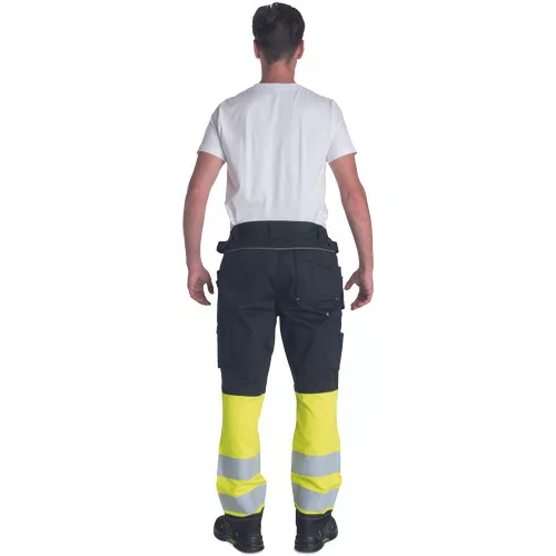 • men's HI-VIS working pants with an elastic waistband • 2 multifunctional flying pockets • 2 printed 7.5 cm wide reflective stripes on bottom legs • Oxford 600D reinforcement at knee areas with optional knee pad insertions • adjustable leg length • reflective piping