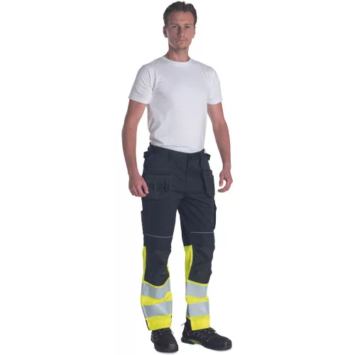 • men's HI-VIS working pants with an elastic waistband • 2 multifunctional flying pockets • 2 printed 7.5 cm wide reflective stripes on bottom legs • Oxford 600D reinforcement at knee areas with optional knee pad insertions • adjustable leg length • reflective piping