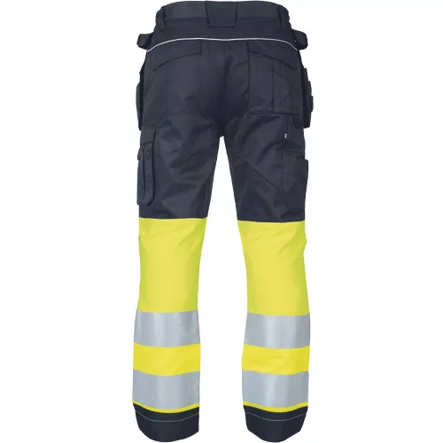 • men's HI-VIS working pants with an elastic waistband • 2 multifunctional flying pockets • 2 printed 7.5 cm wide reflective stripes on bottom legs • Oxford 600D reinforcement at knee areas with optional knee pad insertions • adjustable leg length • reflective piping