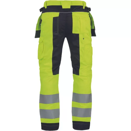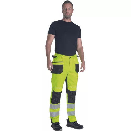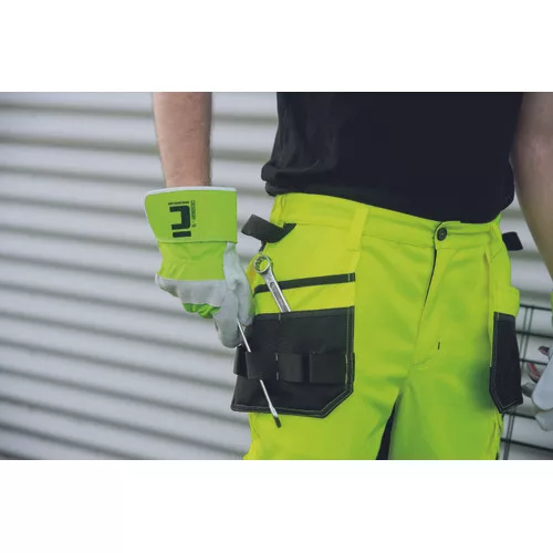 • men's HI-VIS working pants with an elastic waistband • 2 multifunctional flying pockets • 2 printed 7.5 cm wide reflective stripes on bottom legs • Oxford 600D reinforcement at knee areas with optional knee pad insertions • adjustable leg length