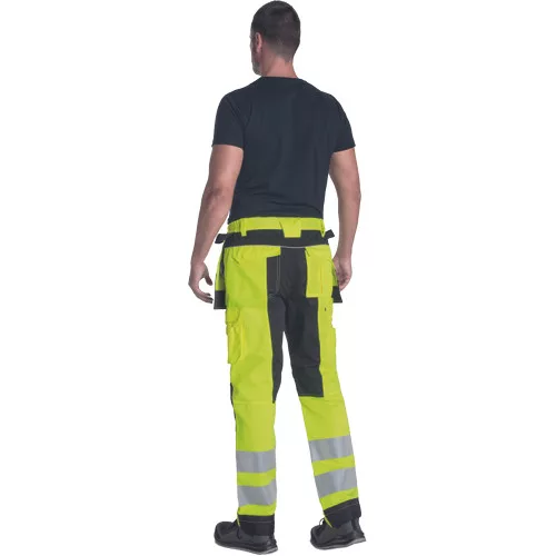 • men's HI-VIS working pants with an elastic waistband • 2 multifunctional flying pockets • 2 printed 7.5 cm wide reflective stripes on bottom legs • Oxford 600D reinforcement at knee areas with optional knee pad insertions • adjustable leg length