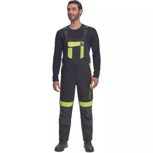 • férfi mellesnadrág rugalmas derékkal, széles pántokkal, műanyag csatokkal • 2 első zseb, 1 oldalzseb, 1 nagy mellzseb, 2 hátsó zseb • 2 kis hátsó zseb a jobb száron • fényvisszavető szegés • Oxford 600D megerősített térdrész, térdvédőtartó • leengedhető szárak
