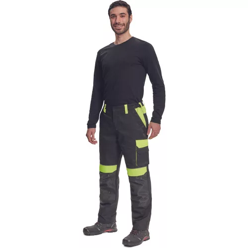 • férfi munkanadrág rugalmas derékkal • 2 első zseb, 1 dupla oldalzseb a bal száron • 2 hátsó zseb • 2 kis hátsó zseb a jobb száron • fényvisszavető szegés • Oxford 600D megerősített térdrész, térdvédőtartó • leengedhető szárak